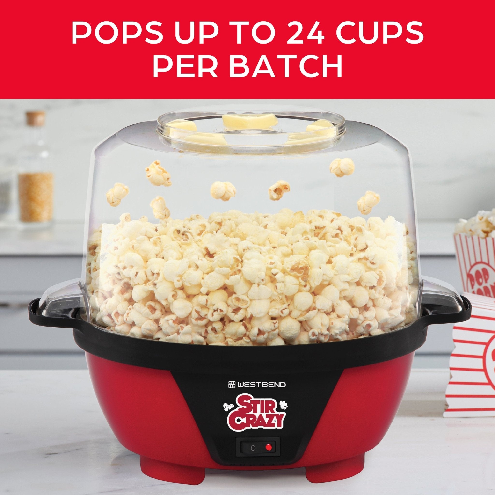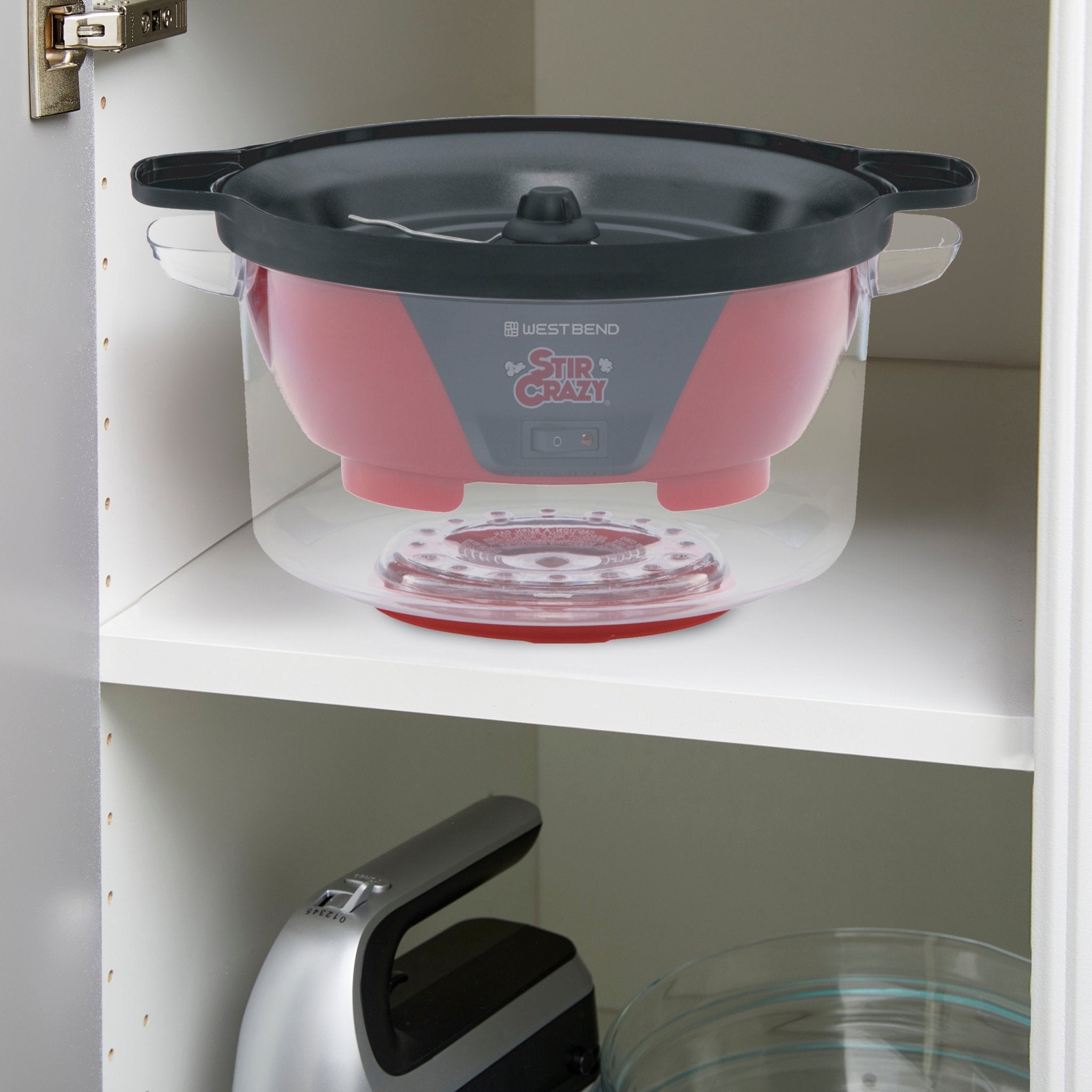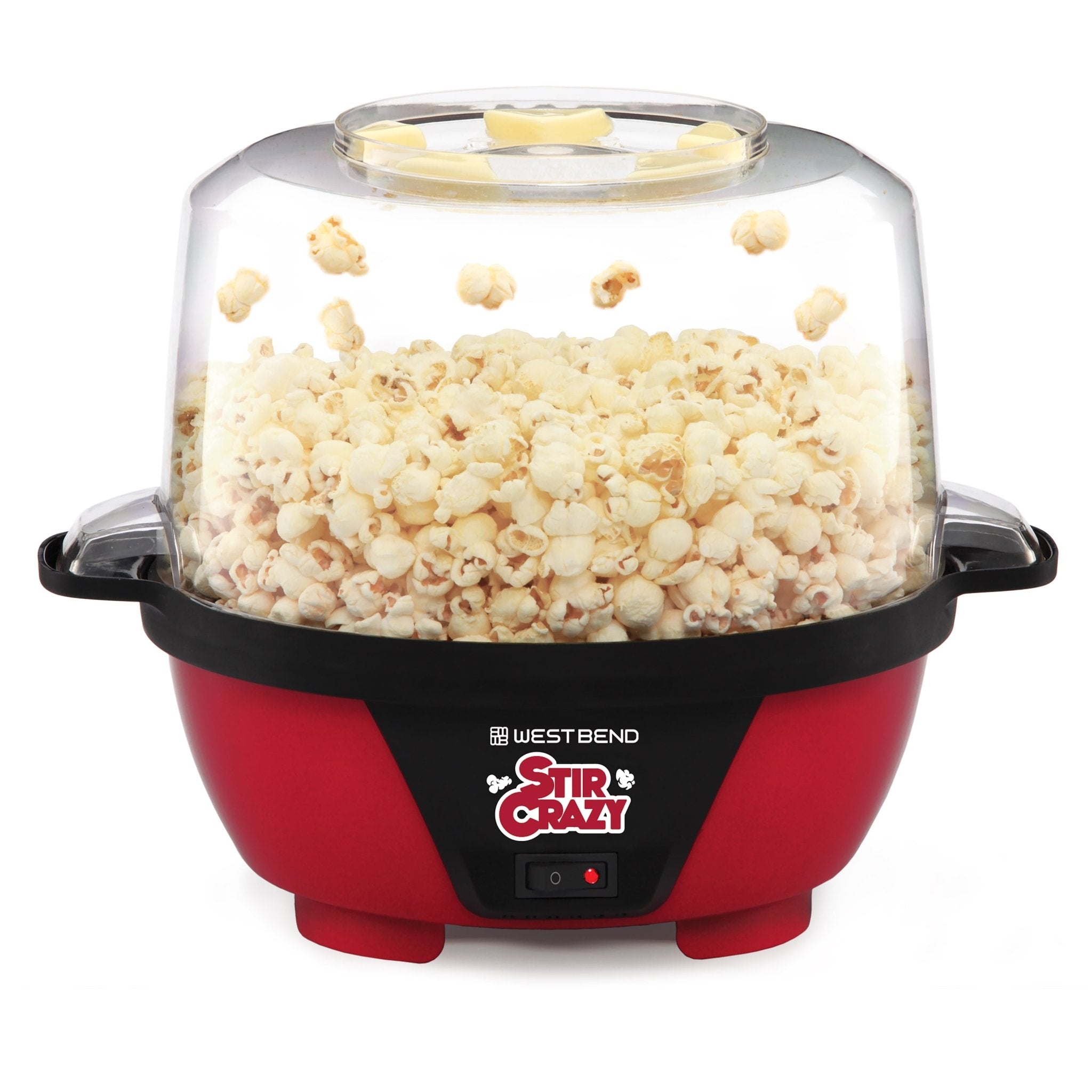 Quickly treat family and friends to a batch of delicious, hot, fluffy oil-popped, stirred popcorn with the West Bend 6Qt. Stir Crazy Stirring Popcorn Machine. This compact machine gives you the move-theater taste you love with its unique stir rod technology that keeps kernels moving to prevent any burning. The butter melting well in the cover butters popcorn as it pops. Then use the snap on cap when you flip the cover to use it as a serving bowl. And, the ventilation vents release moisture ensuring great-tasting, crunchy popcorn. When popping is done clean up is a breeze with the non-stick surface and dishwasher-safe cover and butter lid. A simple on and off button makes operation a breeze and makes shutting the unit once popping is done a simple task. The space saving design offers onboard cord wrap and nesting storage. With six quarts per batch, you’ll look forward to serving this traditional treat for everyday snacking, at-home movie nights or for any fun occasion. And, once your popcorn is done the possibilities are endless because you can be creative and add your own flavors for a true gourmet experience.