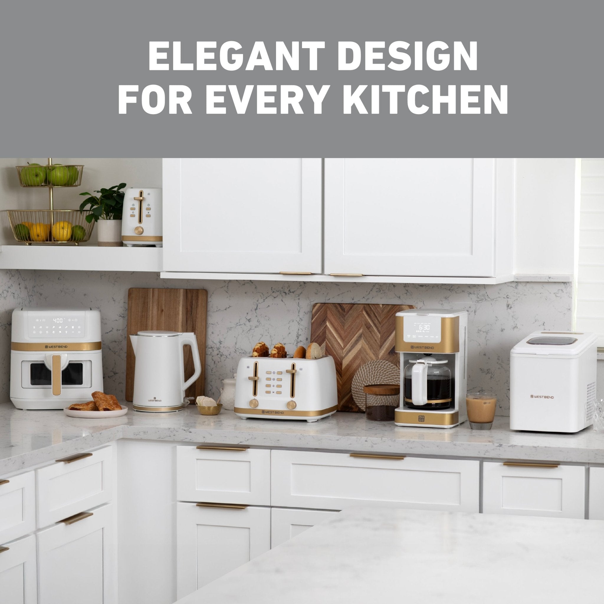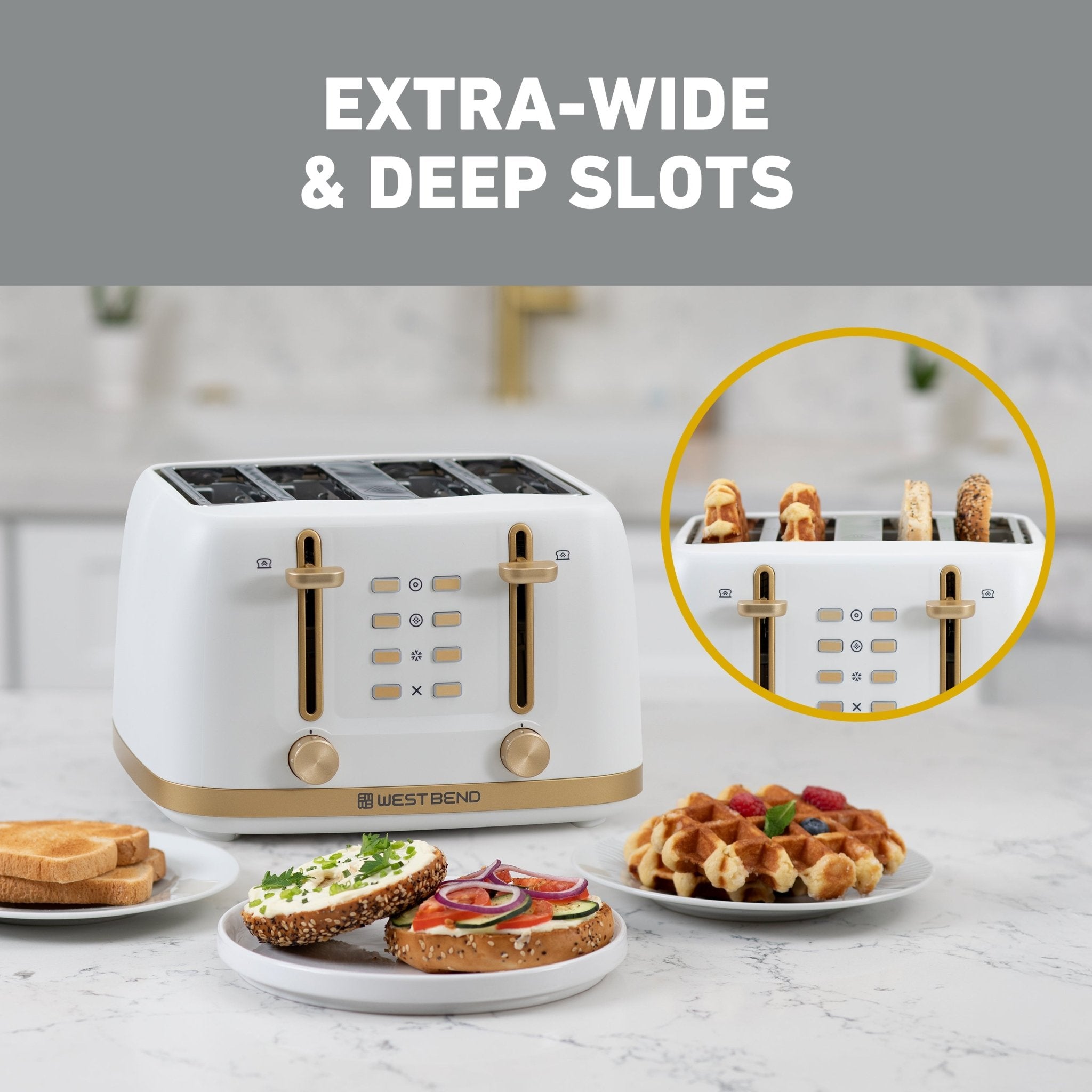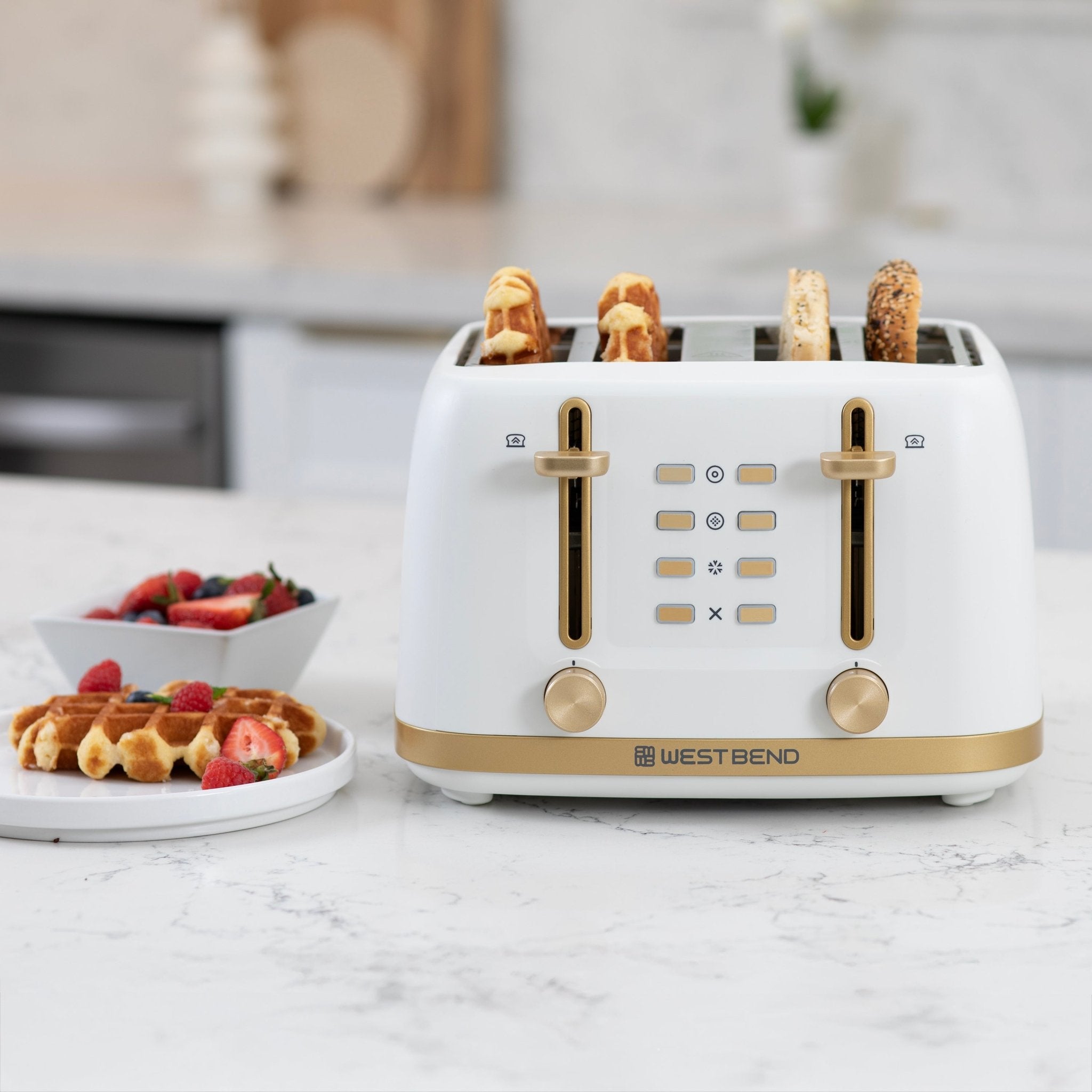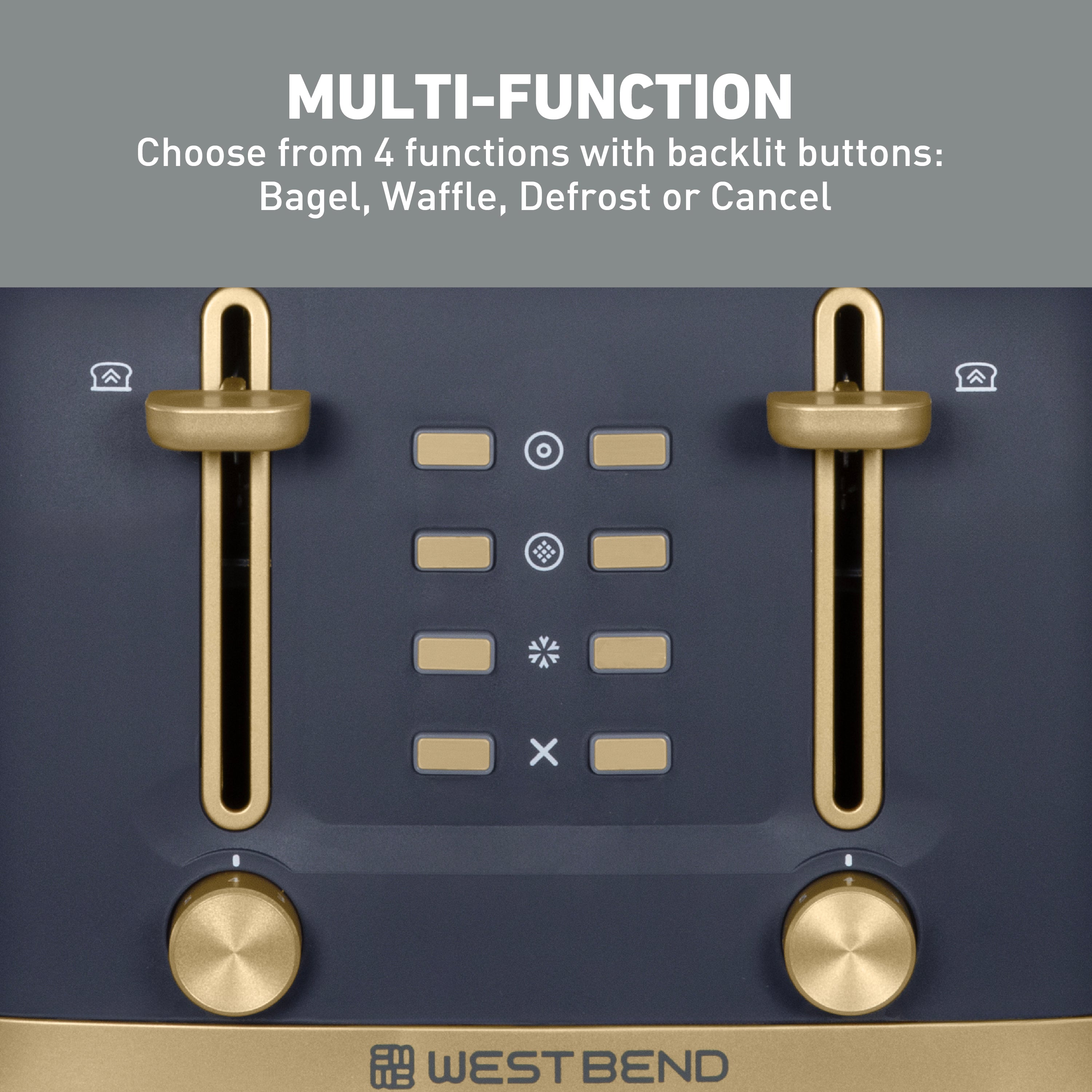 The West Bend “Timeless” Collection features elegant gold accents that will enhance any kitchen décor. Start your morning off with perfectly toasted treats with the West Bend Timeless 4-Slice Toaster. Simply designed, the user-friendly interface features four functions: Bagel, Waffle, Defrost and Cancel, with an LED light that illuminates when the desired function is selected. This easy-to-use toaster also has a shade selector knob with seven levels of browning to meet different needs. When your food is done, easily remove it from the toaster with the manual, high-lift lever. Anti-Jam and Auto-Shut-Off features provide added safety. Keep your toaster clean and crumb-free with the easy-clean removable crumb tray. This classic toaster has gold accents, including a cool-touch handle, that will complement any kitchen. Covered by the West Bend 12-Month Limited Warranty.