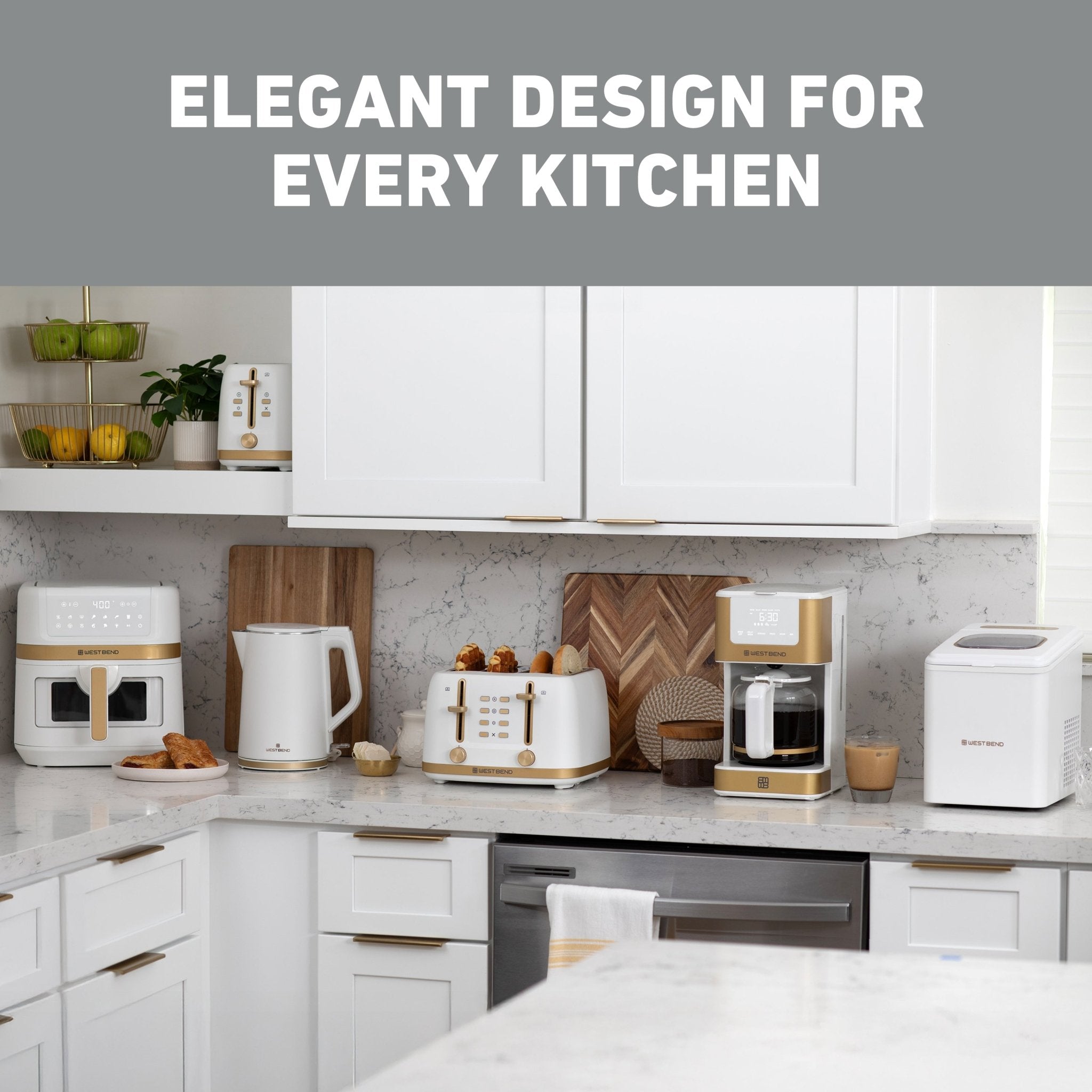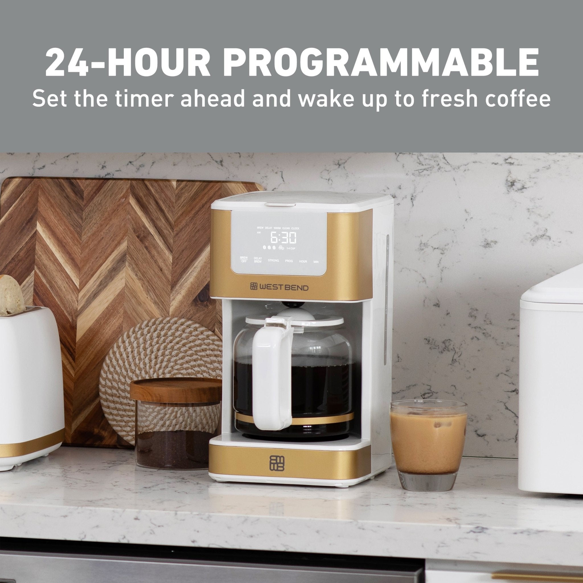 The West Bend “Timeless” Collection features elegant gold accents that will enhance any kitchen décor. Brew your way in style with the West Bend 12 Cup Programmable Iced & Hot Coffee Maker. The 24-hour programmable feature with delayed brew option allows you to set the timer ahead and wake up to the aroma of freshly brewed coffee. Customize the brew strength to suit your taste–choose from mild, medium, bold or over ice. Brew as little as one cup or up to 12 cups of coffee and optimize your smaller batch brewing with the 1-4 cup option. Enjoy a cup mid brew without making a mess with the anti-drip feature. This versatile coffee maker includes a trivet that can be placed on the heating plate to block heat transfer when brewing coffee over ice. Keep your coffee maker optimized for great performance and better tasting coffee with the cleaning reminder. Covered by the West Bend 12-Month Limited Warranty.