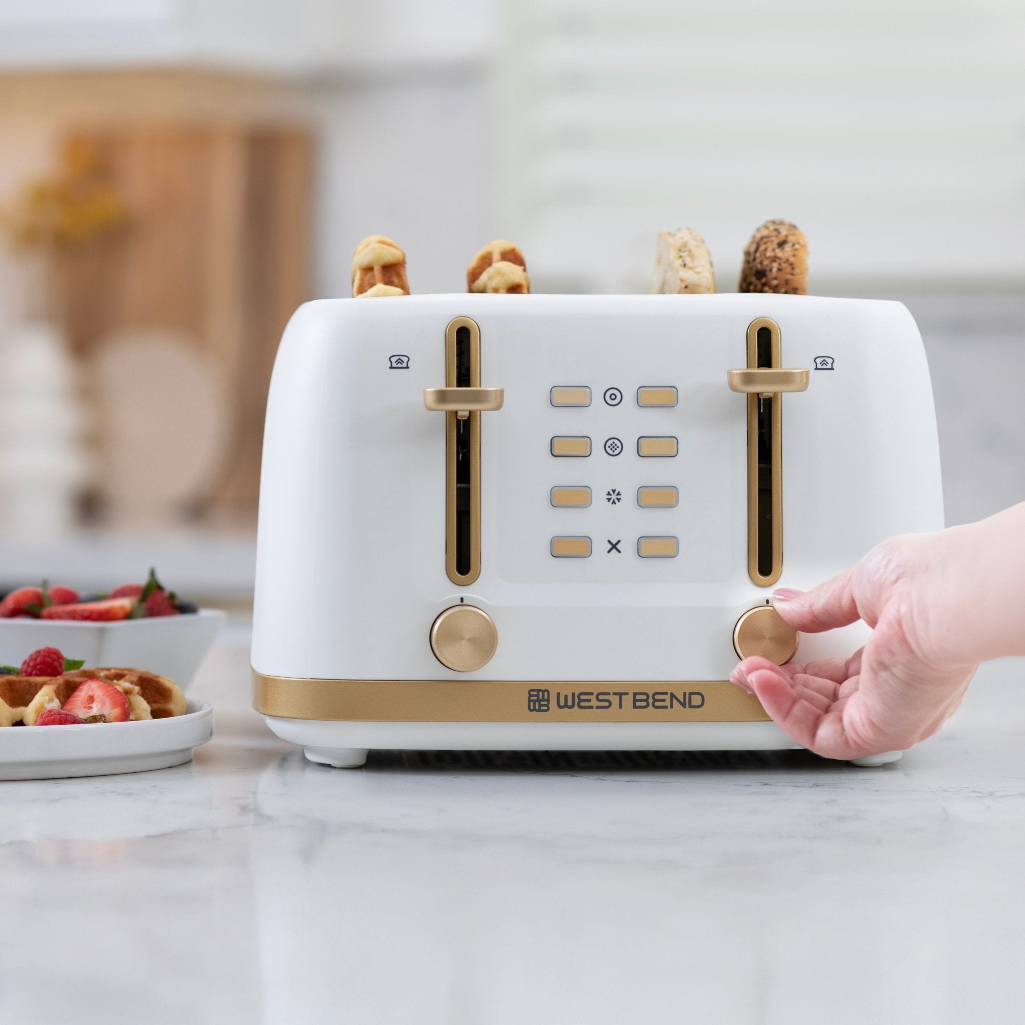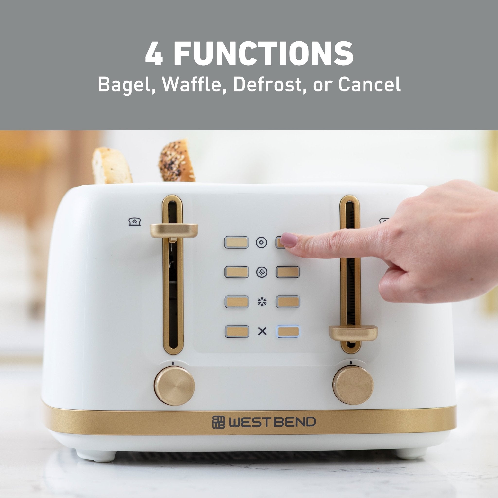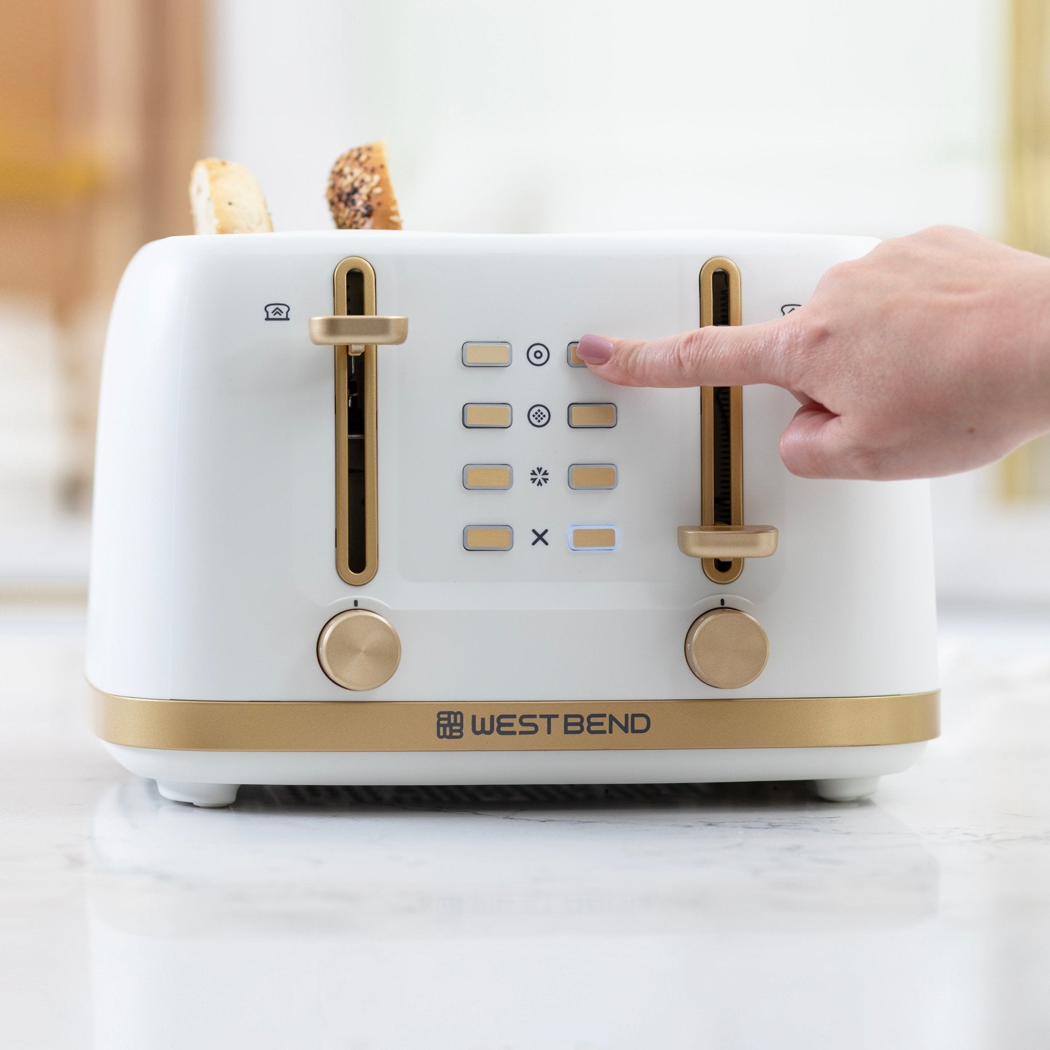 The West Bend “Timeless” Collection features elegant gold accents that will enhance any kitchen décor. Start your morning off with perfectly toasted treats with the West Bend Timeless 4-Slice Toaster. Simply designed, the user-friendly interface features four functions: Bagel, Waffle, Defrost and Cancel, with an LED light that illuminates when the desired function is selected. This easy-to-use toaster also has a shade selector knob with seven levels of browning to meet different needs. When your food is done, easily remove it from the toaster with the manual, high-lift lever. Anti-Jam and Auto-Shut-Off features provide added safety. Keep your toaster clean and crumb-free with the easy-clean removable crumb tray. This classic toaster has gold accents, including a cool-touch handle, that will complement any kitchen. Covered by the West Bend 12-Month Limited Warranty.